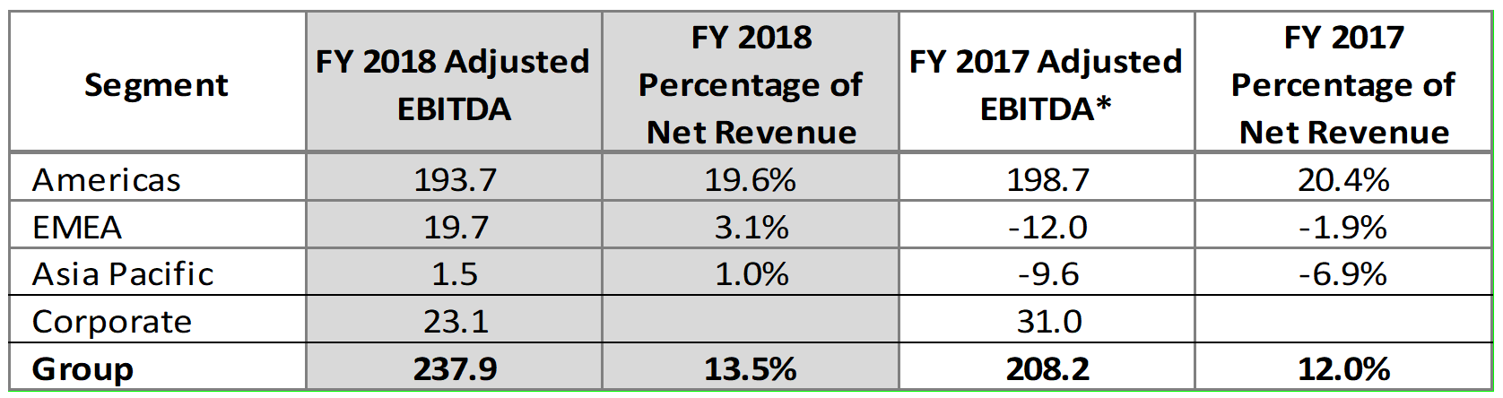 - Both EMEA and Asia Pacific regions delivered full year positive Adjusted EBITDA compared to the negative results posted in FY 2017